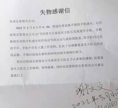 我司鐵保宏泰深圳保安公司安保員姜顯慶隊長在防疫卡點拾到手機一臺。失主特致信表示感謝。