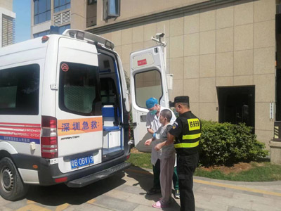 我司鐵保宏泰深圳保安服務公司駐聯建君鈺府分隊安保隊員了解到君鈺府業主一老人突發疾病,病情較重,我司鐵保宏泰保安員了解情況以后,馬上協調保安員觀察出入口情況,做好救護車到來時的入園和出園協助,并親自陪同業主回家協助病人家屬安撫病人情緒、準備入院事宜。