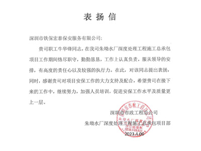 深圳市市政工程總公司朱坳水廠深度處理工程施工總承包項目部致信表揚我司鐵保宏泰深圳保安公司安保隊員牛華鋒同志工作期間恪盡職守,勤勤懇懇,工作上認真負責,服從領導的安排,有高度的責任心以及較強的執行力。特致信提出表揚。