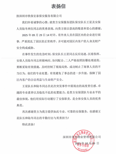 深圳美達物業管理公司致信表揚我司鐵保宏泰保安
