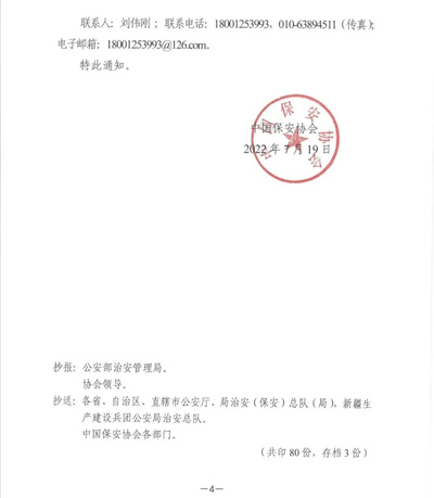 中國(guó)保安協(xié)會(huì)發(fā)布《關(guān)于組織做好保安行業(yè)主題日宣傳活動(dòng)的通知》(中保協(xié)【2022】13號(hào)),通知指出,公安部治安管理局決定在7月24日組織開(kāi)展以“喜迎二十大、保安護(hù)平安”為主題的全國(guó)保安行業(yè)主題日宣傳活動(dòng)。